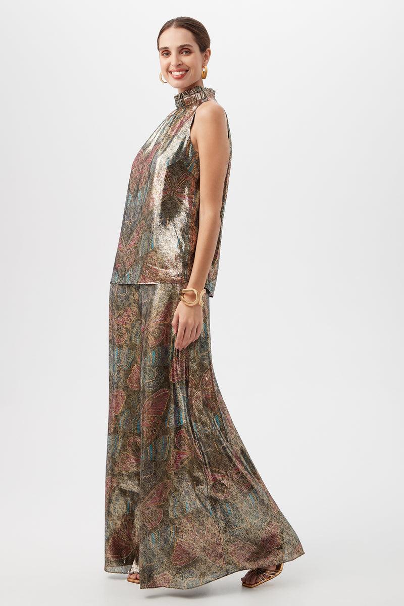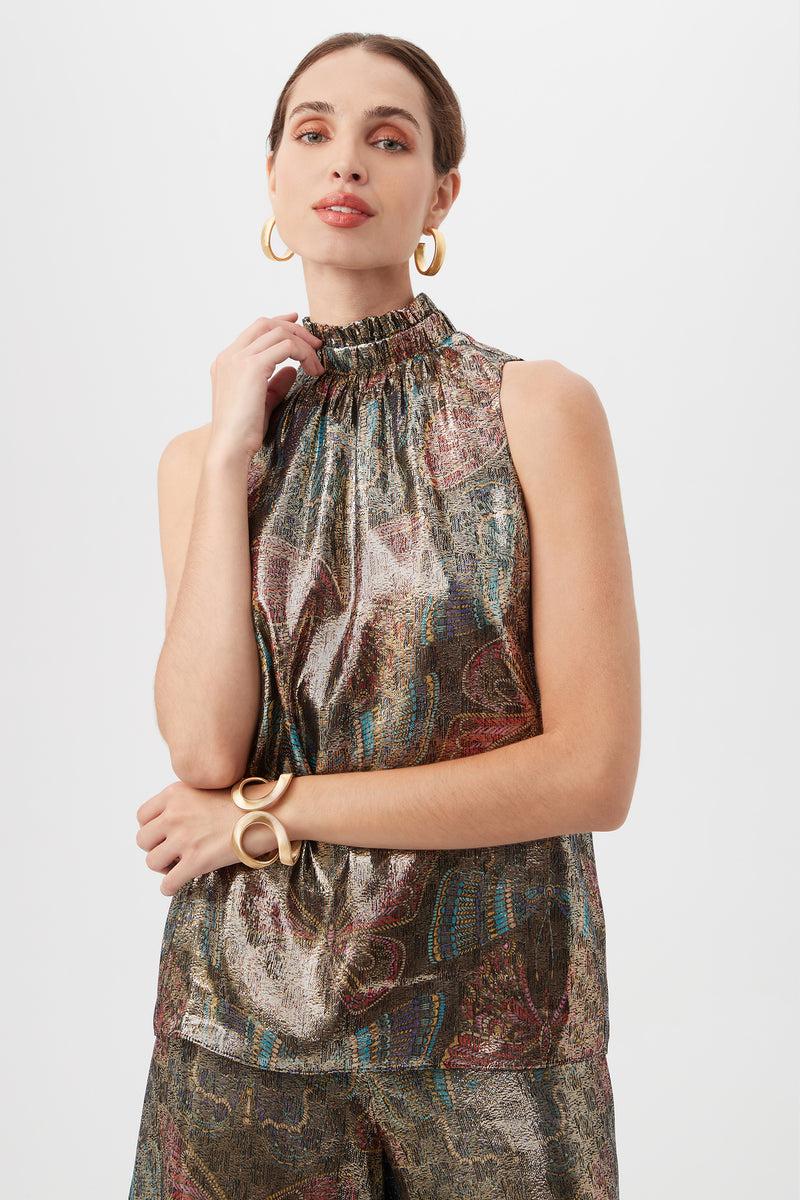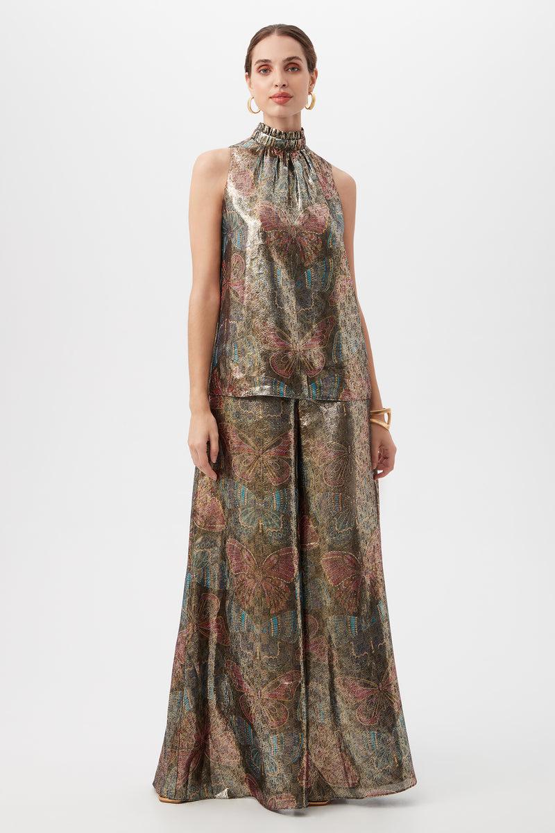 Elevated and chic, this dressy sleeveless blouse features a smocked mockneck, an A-line silhouette, and a gorgeous butterfly silk fabrication. Pair this sleeveless silk top with our matching pants for a complete look at your next dressed-up event.