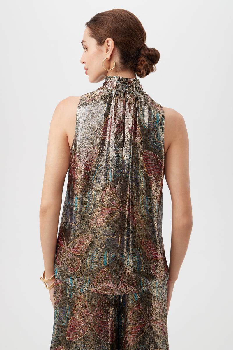 RISSA BUTTERFLY PRINT SILK SLEEVELESS MOCKNECK TOP