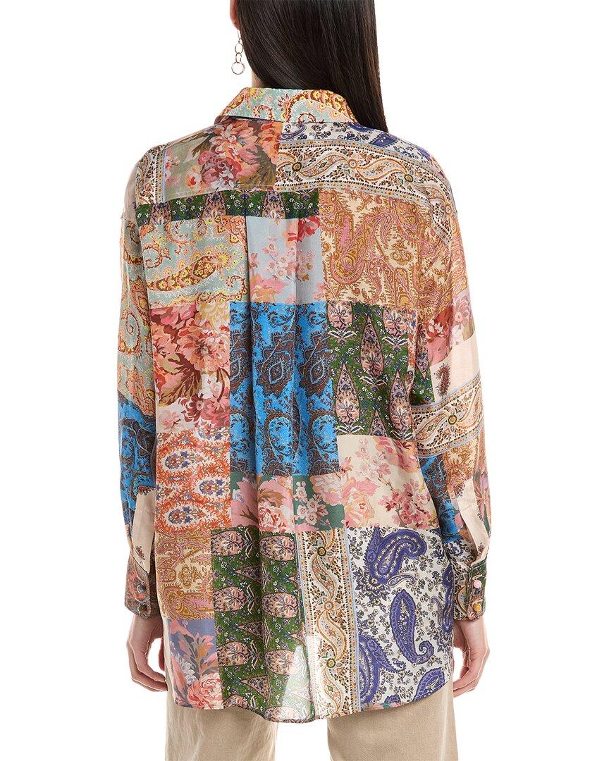 Introducing the Zimmermann Devi Silk Shirt, a stunning piece from the iconic Australian brand known for its sophisticated femininity and original prints. This patch paisley shirt features a spread collar, button cuffs, and a curved hem for a stylish yet versatile look. Made from 100% silk, this shirt is luxurious and perfect for adding a touch of elegance to any outfit. Pair it with your favorite bottoms for a chic and feminine ensemble. Get ready to turn heads in the Zimmermann Devi Silk Shirt.