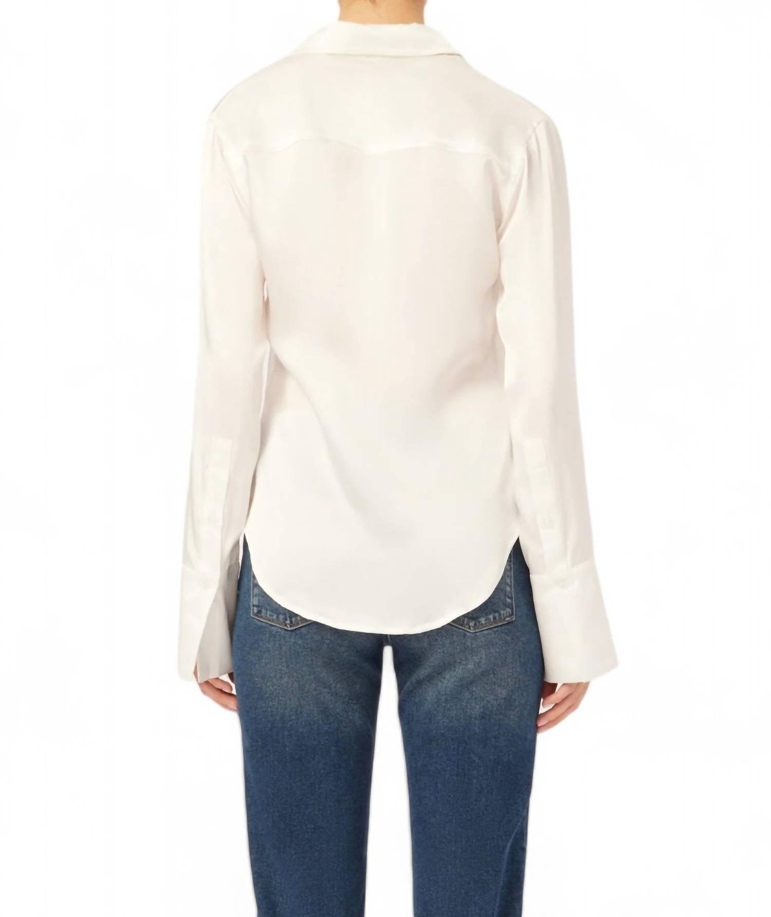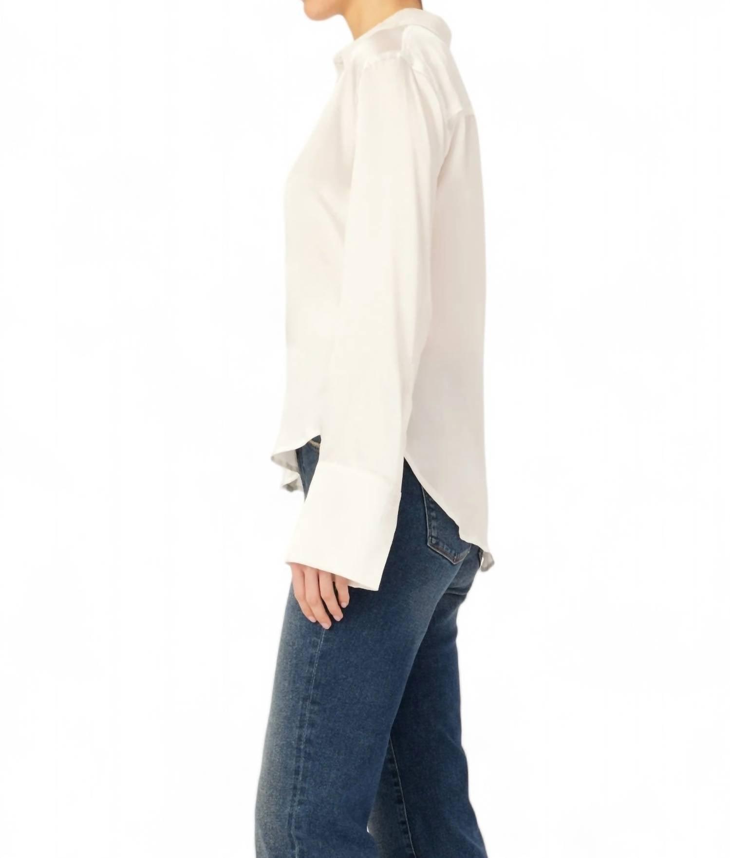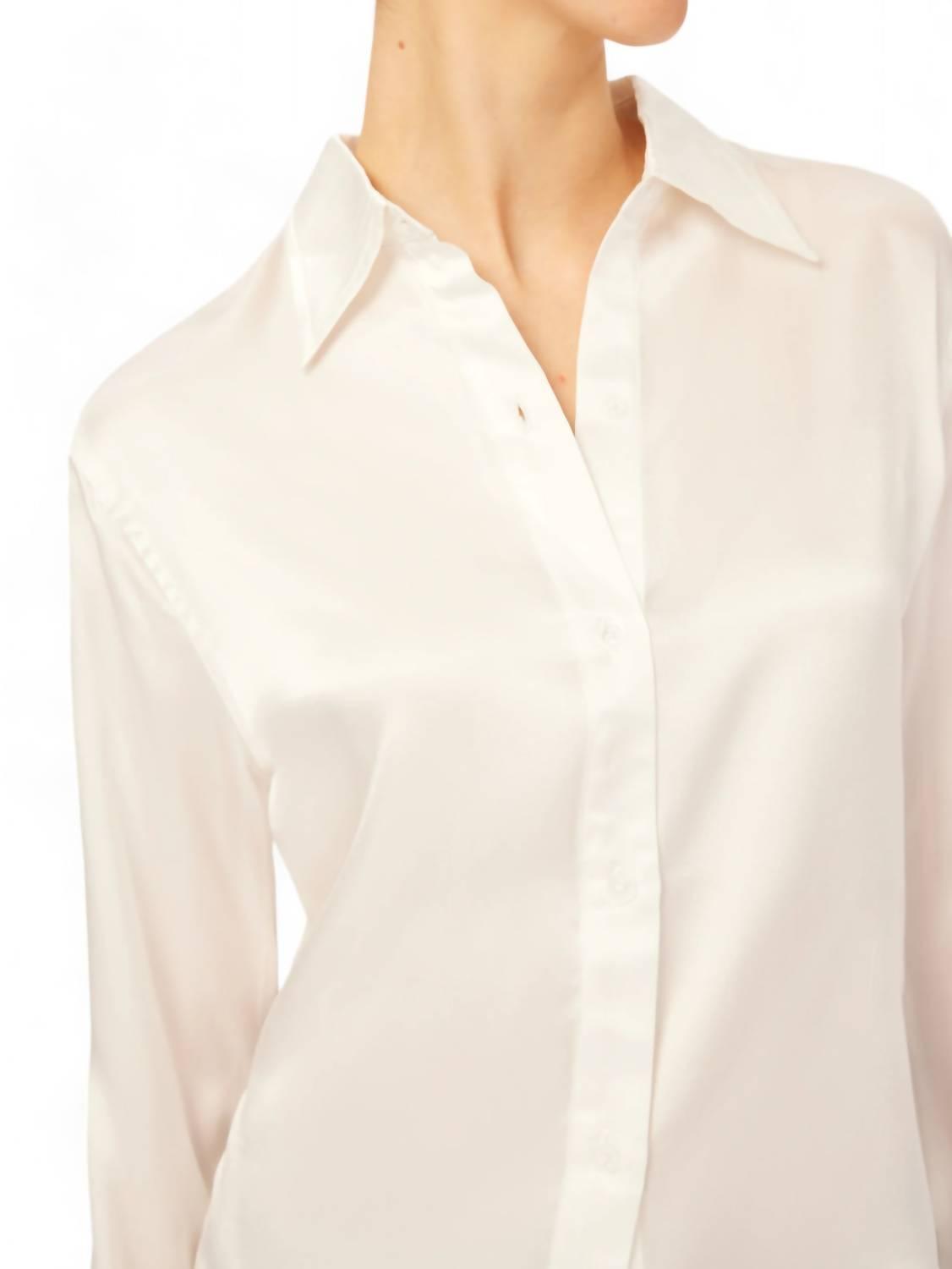 Pair this with your favorite jeans and slides for your next girls night out.This slim-fit button-down shirt features a pointed collar, a rounded shirt tail hem, and tall cuffs for a sleek look. Crafted from 100% silk and should be dry cleaned. It measures approximately 24.5 inches in length and has a bottom opening of 39 inches. Model who is 5'10" and wearing size XS.