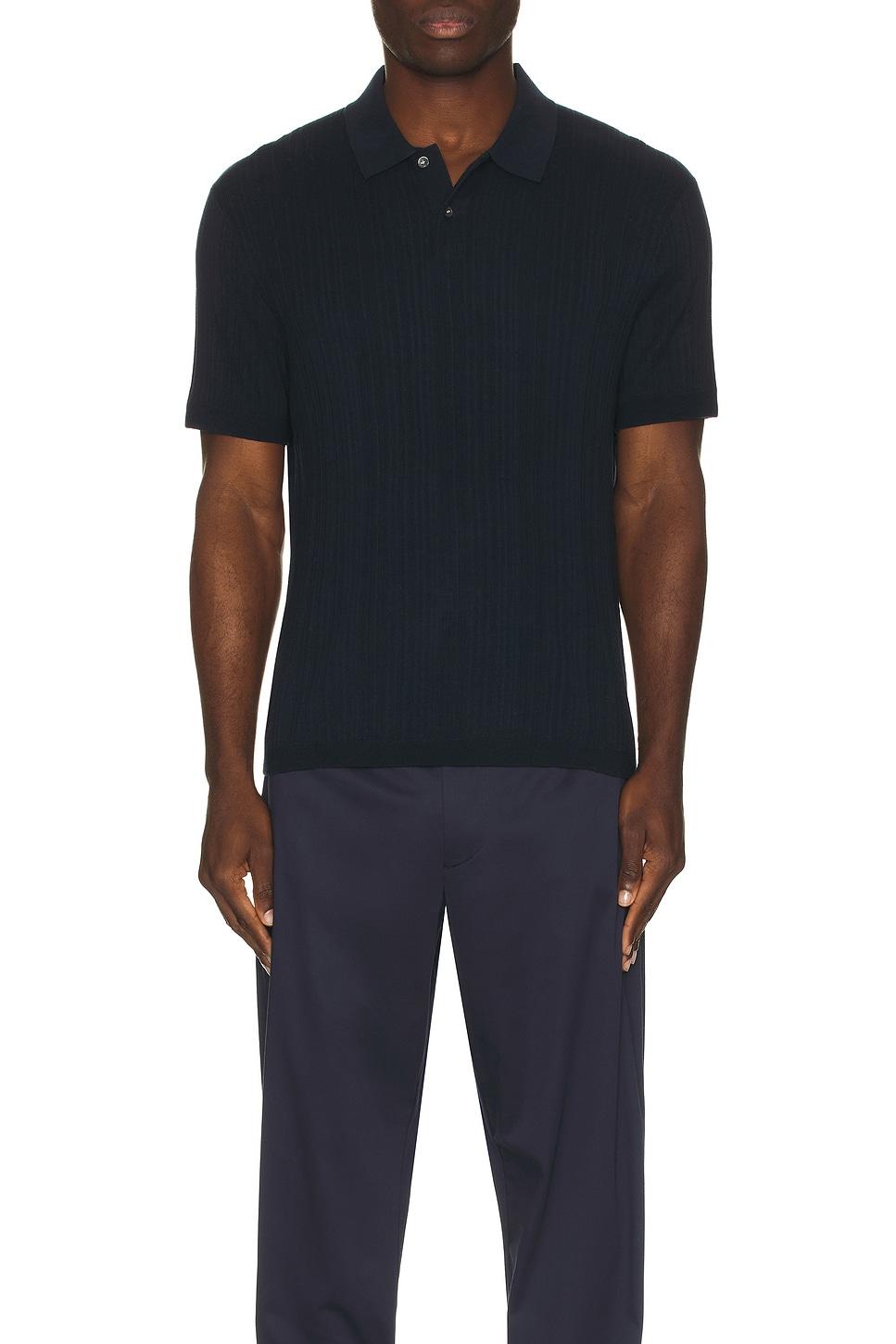 Theory Damian Short Sleeve Polo in Navy 94% cotton 5% recycled nylon 1% spandex. Made in Vietnam. Hand wash. Partial front button closure. Ribbed trim. Lightweight ribbed knit fabric.