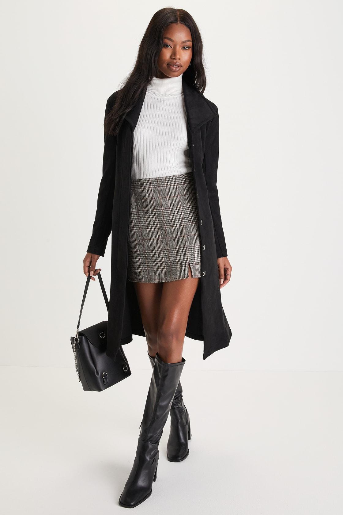 Stroll through the falling leaves with an upgraded style in the Lulus Elevated Season Black Vegan Suede Collared Trench Coat! Soft slightly stretchy vegan suede shapes this chic coat with a collared neckline framed by long sleeves. The longline trench coat silhouette features a hidden snap button placket, belt loops, and a tying sash belt. Kick pleat at back.