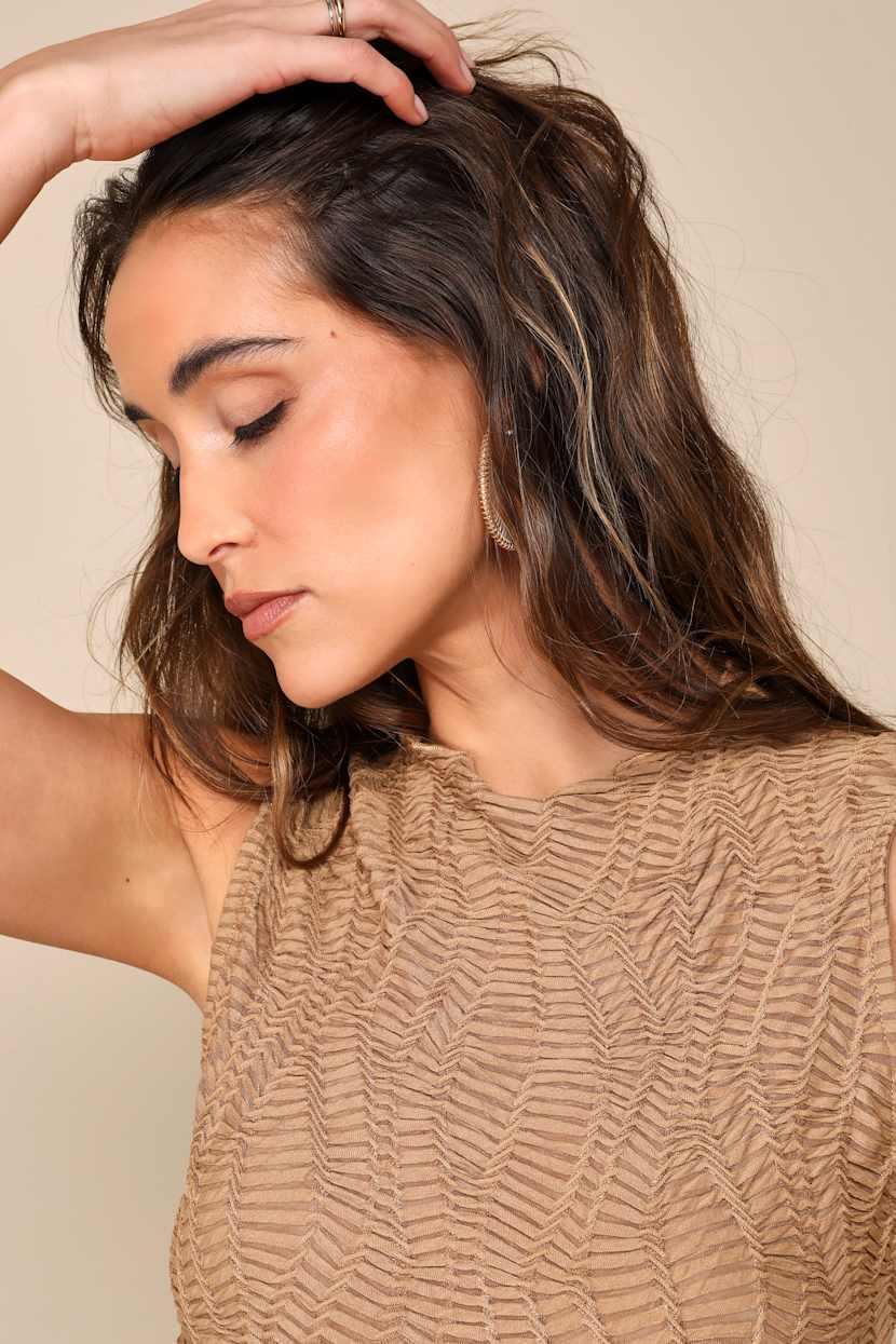 You'll be calling the shots and setting trends when you style the Lulus My Rules Light Brown Textured Mesh Mock Neck Tank Top! Lightweight, textured, mesh-like fabric creates an intricate design as it shapes this modern top with a chic mock neckline and a sleeveless, figure-hugging silhouette that falls to a slightly cropped hem. Pair with your favorite gold accessories for an extra-elevated look!