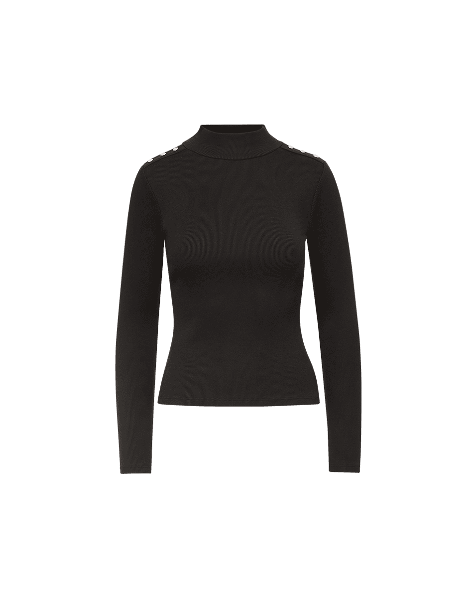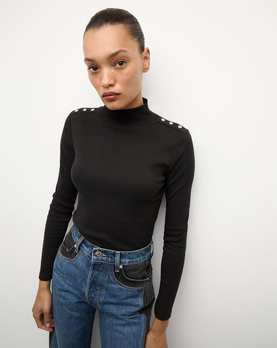 A fashion-forward take on the classic long-sleeve tee. Made from premium stretch cotton, the Nate is defined by a slim fit, a mock neck, and button embellishments on the shoulder. Wear on its own or as a base layer.