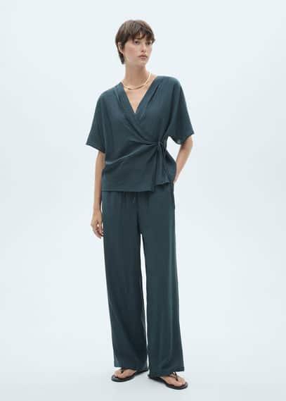 Take advantage of the best discount of the year with Black Friday, Flowy fabric, Crossed V-neck, Short sleeve, Knot closure, Side closure, Co-ord, The model is 1.74 tall and is wearing a size 36.