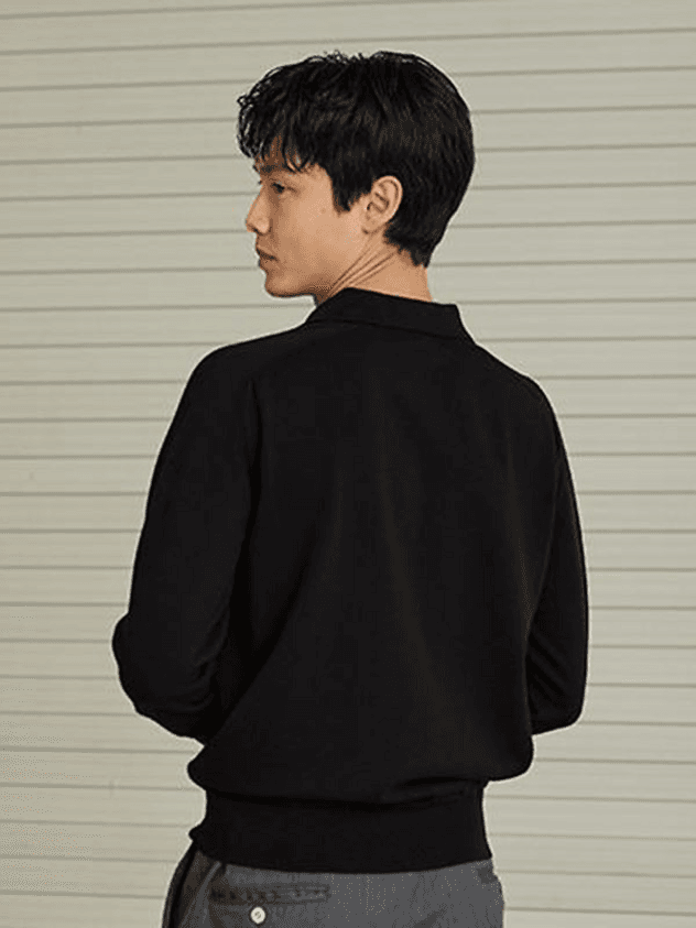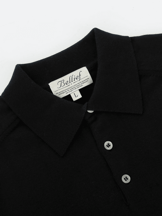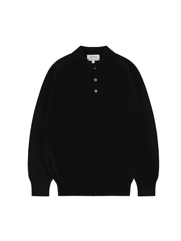 This is classic polo sweater finished with clean saddle stitching and mother of pearl buttons. It's versatile to wear as solo or layering item and works well with various bottoms. It's knitted from hard twisted cotton yarn so it has lightweight, enough tension, soft touch and easy to care.