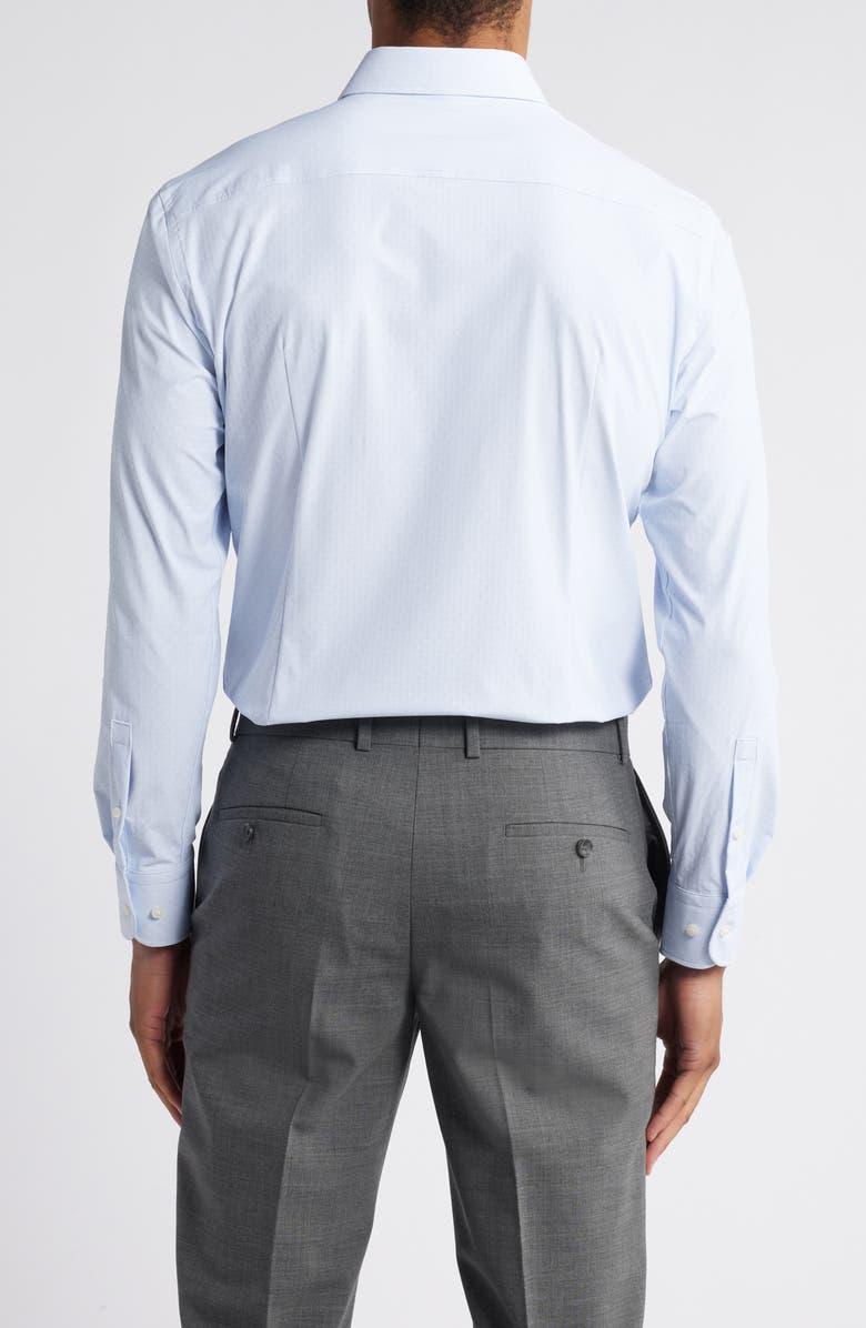 Dobby-dotted pinstripes smartly pattern a dress shirt tailored from a lightweight nylon blend that offers plenty of stretch to keep you moving comfortably through your day.