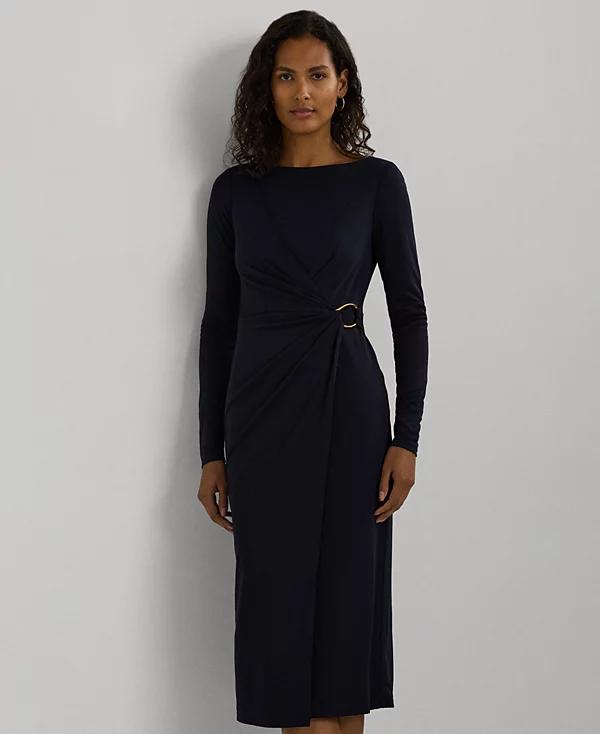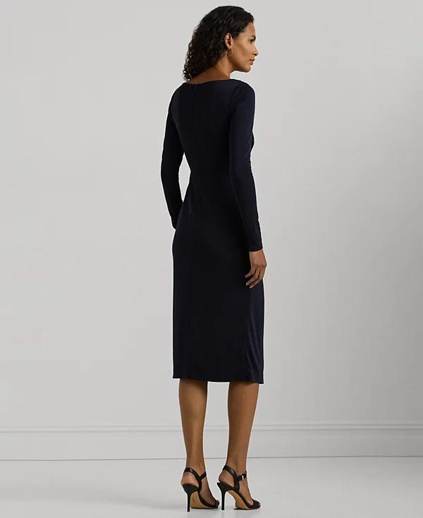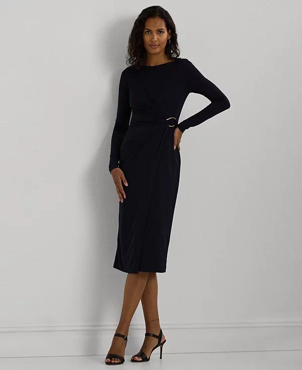 Cut for a calf-grazing length, the figure-defining sheath silhouette of this Lauren Ralph Lauren cocktail dress is realized in stretch-infused jersey for a smooth hand and ease of movement. A pleated wrap-style overlay gathers into an "LRL"-engraved buckle at the waist, lending to its elegant allure.