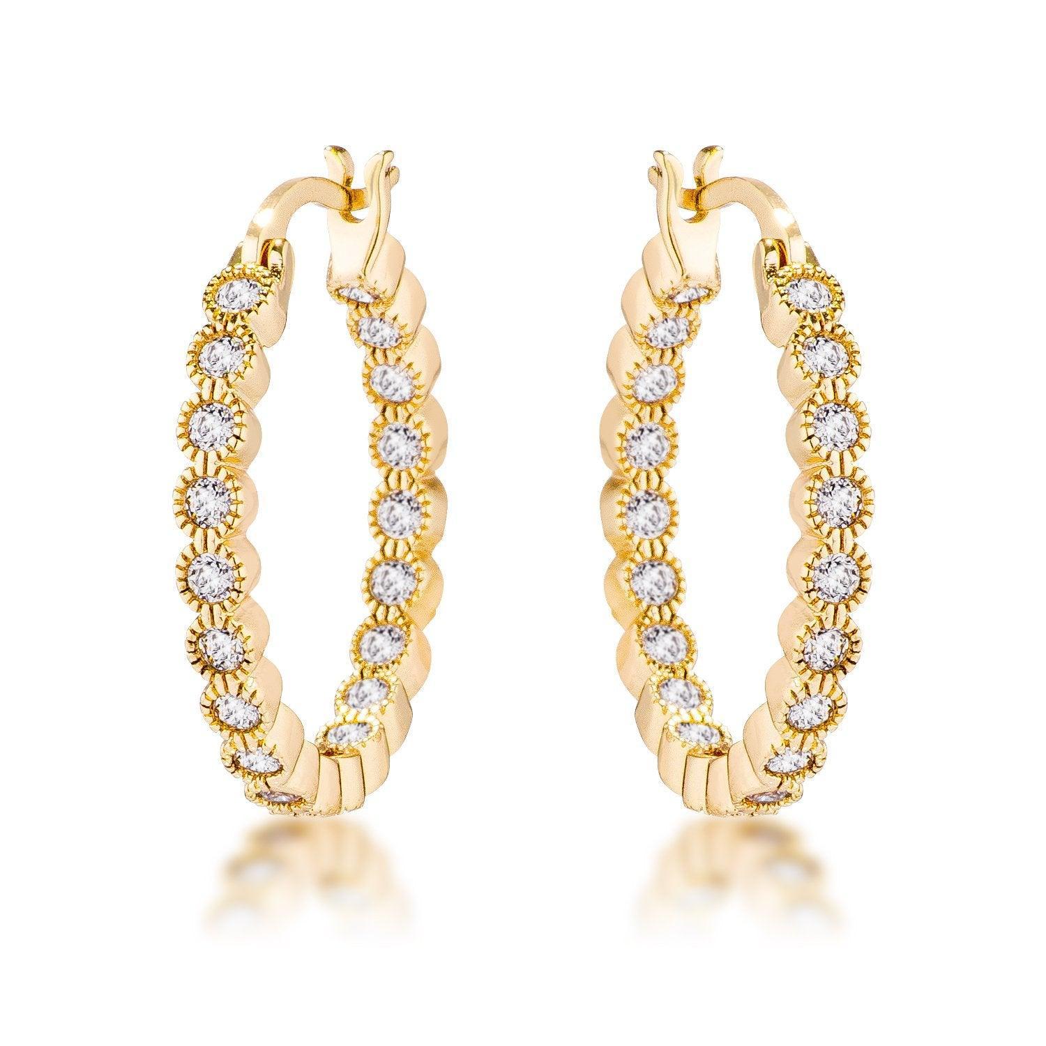 Mid-sized hoops measuring to a near 24mm in length plated in gold plating offers a classic touch yet remains versatile. Dressed up or dressed down a pave ring of clear CZ in round cuts in a dotted bezel offers just the right amont of shine ready to catch the light from any perspective.